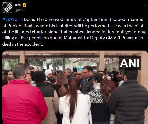 t Pawars, four more families are mourning today. Learjet 45, an aircraft that crashed in Baramati on Wednesday morning, was carrying five people: Deputy Chief Minister Ajit Pawar, his personal security officer Vidip Jadhav, flight attendant Pinky Mali, Pilot-in-Command Sumit Kapur, and Second-in-Command Shambhavi Pathak.