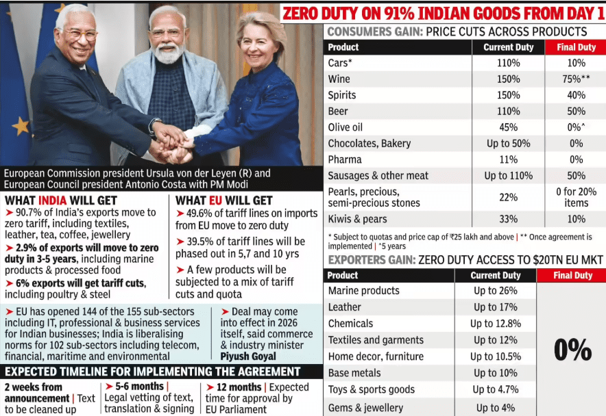 CBAM (Carbon Tax): The EU’s Carbon Border Adjustment Mechanism could tax Indian steel and aluminum exports if they aren’t green enough, possibly countering the benefits of tariff removal.